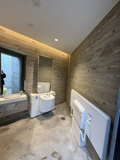 恵比寿公園トイレです(片山正通氏デザイン)。コンクリートの全面に木目をつける加工(本実(ほんざね)加工)を施しているので公園の自然と調和しつつコンクリートの重厚な存在感が目立っていました。