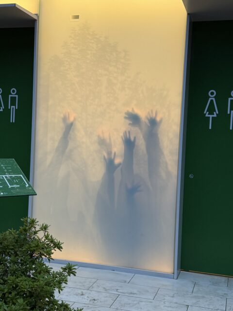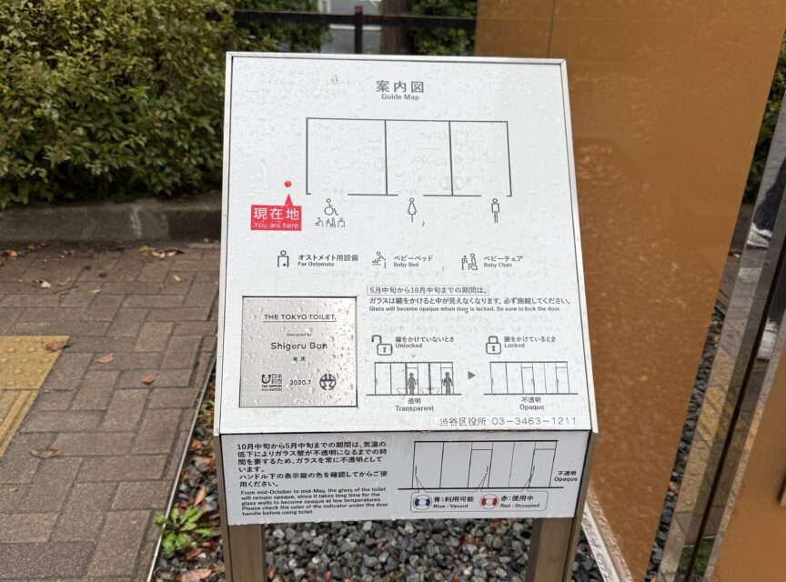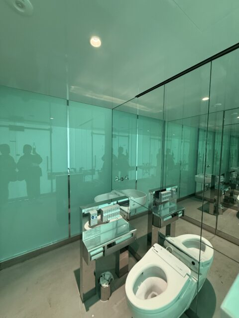 中から鍵をかけると透明なガラスが曇ってトイレ内部が見えなくなるという仕掛けのトイレです。これは、瞬間調光ガラスを使用した仕組みだそうです。利用前に室内がきれいか、中に誰かが隠れていないか確認できるという点で、子供連れや観光客の安全面に配慮されています。しかし、この時期は気温の関係でその仕掛けをやめており、常に不透明の状態にしているそうです。