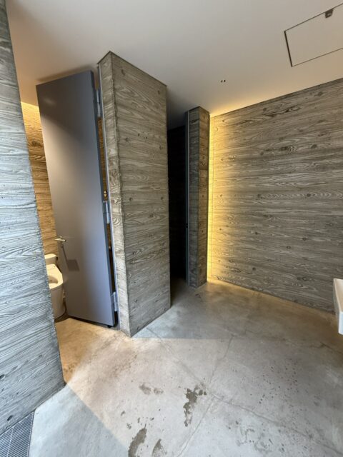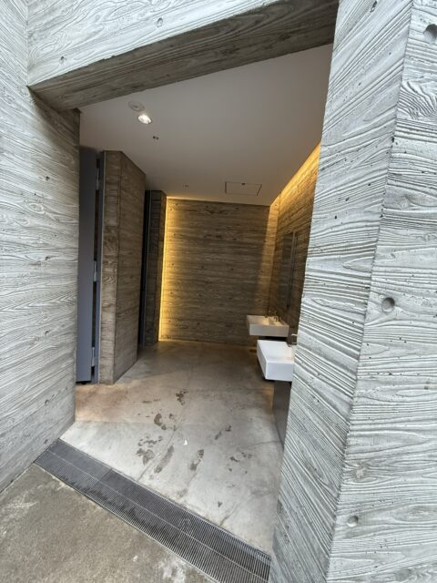 恵比寿公園トイレです(片山正通氏デザイン)。コンクリートの全面に木目をつける加工(本実(ほんざね)加工)を施しているので公園の自然と調和しつつコンクリートの重厚な存在感が目立っていました。