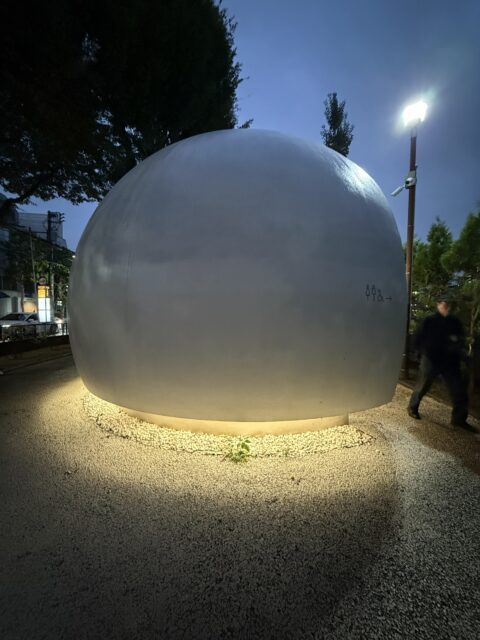 ドーム型が印象的なこのトイレは、自分のスマホと声を使ってドアの開閉や水洗を行うことのできる「非接触型トイレ」をコンセプトにつくられました。残念ながら、見学した際には声にはほぼ反応してくれませんでした。