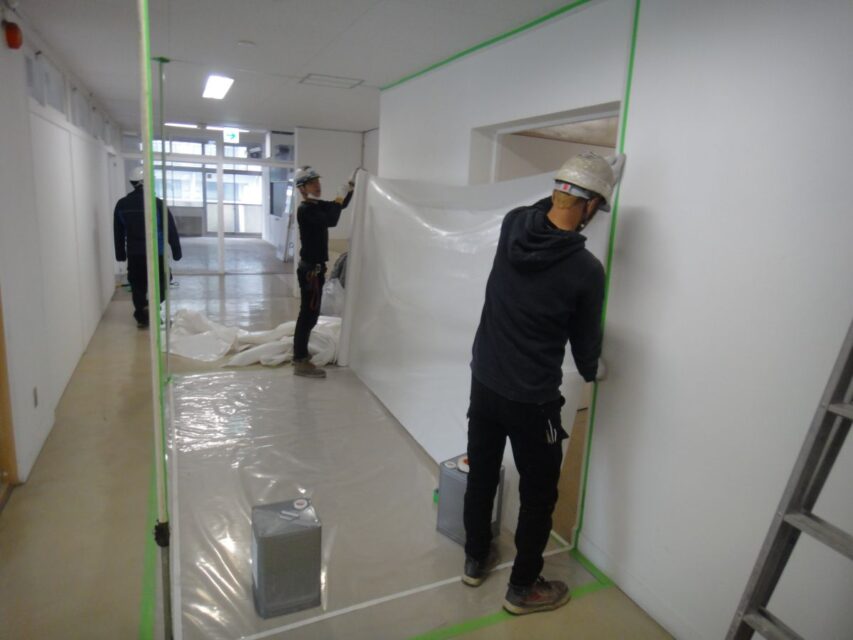 アスベスト(石綿)除去のためのクリーンルームを設営しています。